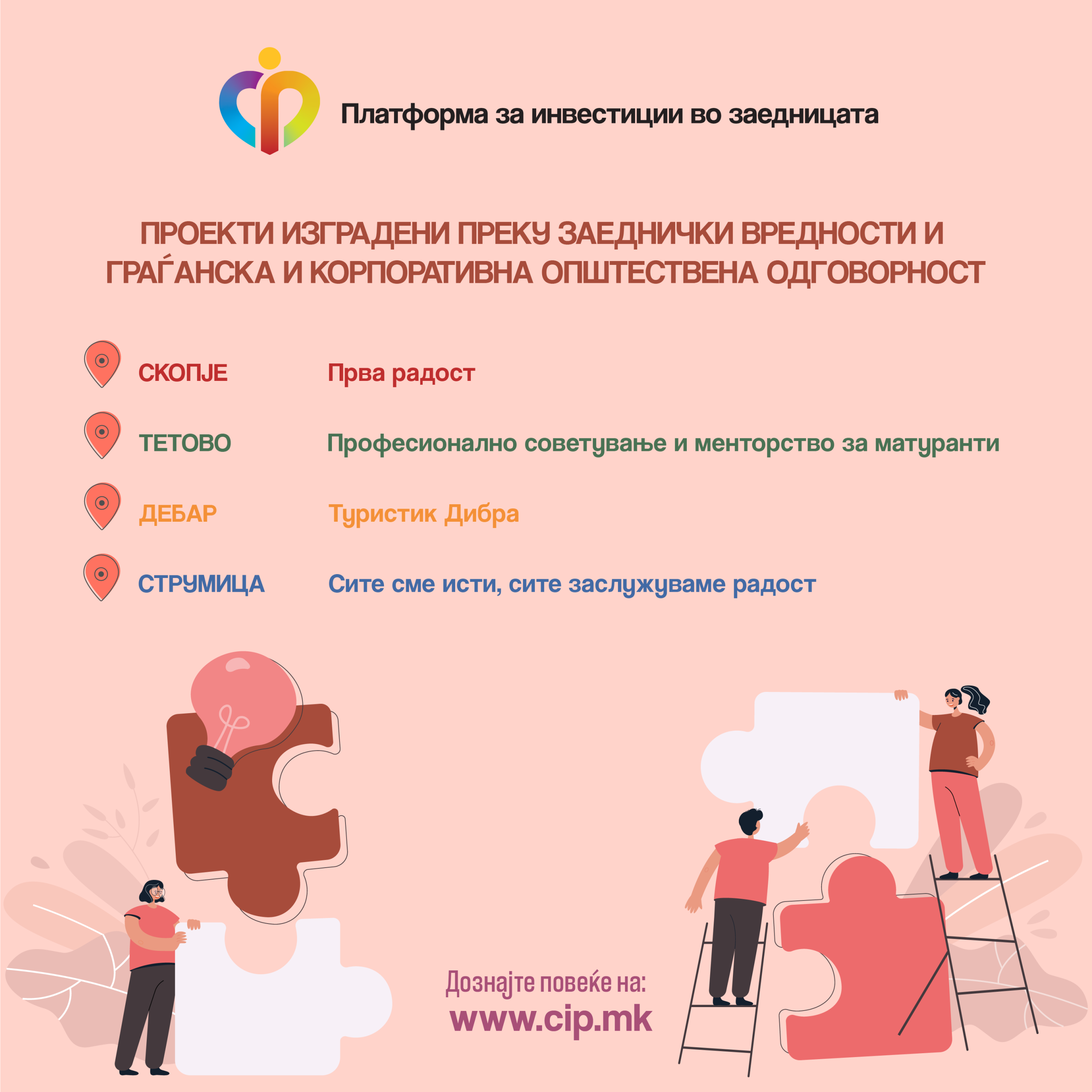 Четирите проектни идеи произлезени за време на обуките од активноста „Менторство за граѓански организации“ кои таргетираат различни целни групи од скопскиот, тетовскиот, дебарскиот и струмичкиот регион, конечно се финализирани во заедничка работа на повеќе граѓански организации кои ја следеа обуката. Во текот на наредната недела овие проекти ќе бидат поставени на Платформата за инвестиции во заедницата како иницијативи за генерирање на финансиски средства