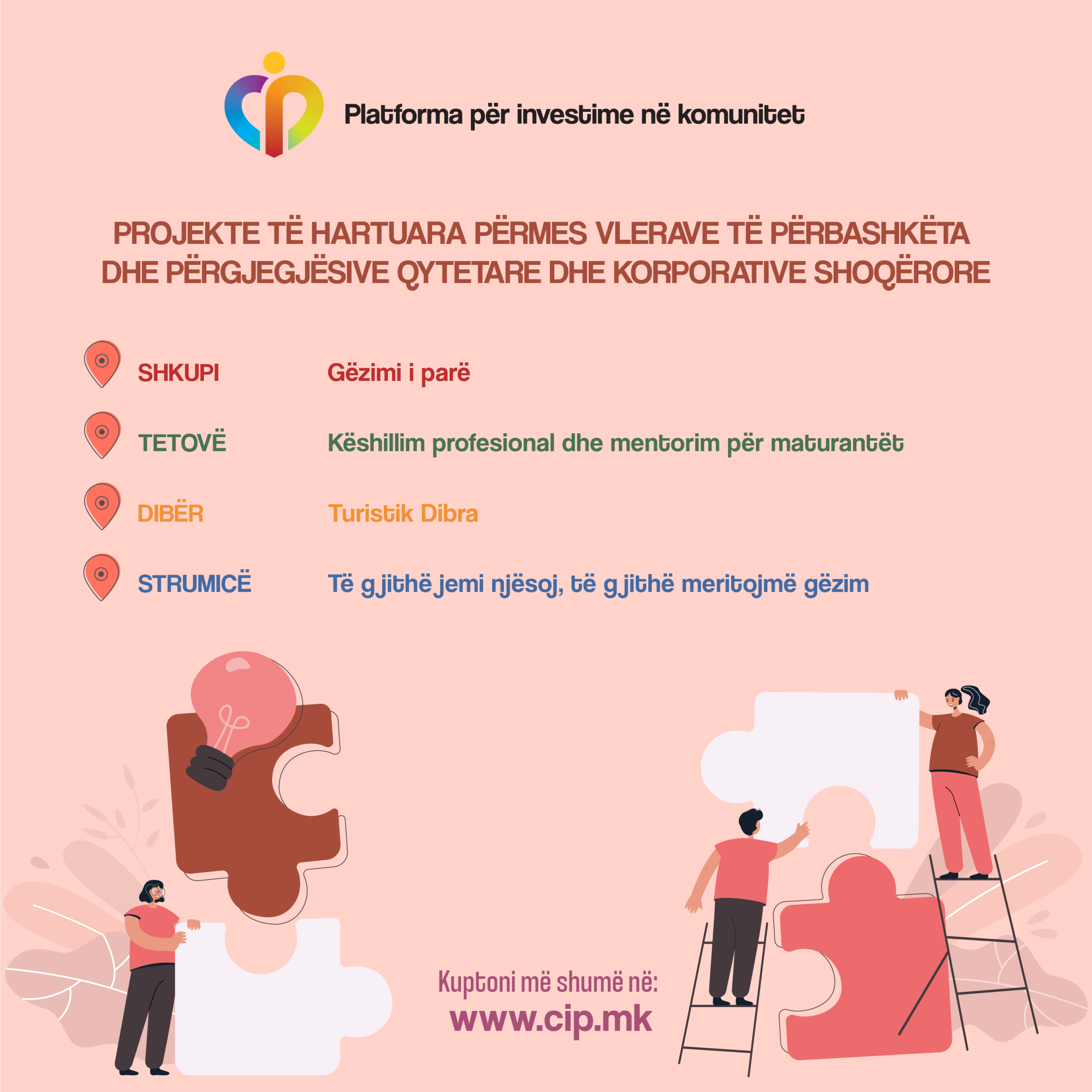 Katër projekt-idetë e zhvilluara gjatë trajnimeve në kuadër të aktivitetit “Mentorimi i organizatave të shoqërisë civile” që targetojnë grupe qëllimore të ndryshme nga rajoni i Shkupit, Tetovës, Dibrës dhe Strumicës u finalizuan me punën e përbashkët të disa organizatave civile që ndoqën trajnimin. Gjatë javës së ardhshme këto projektet do të vendosen në Platformën për investime në komunitet si inicijativa për gjenerim të mjeteve financiare.
