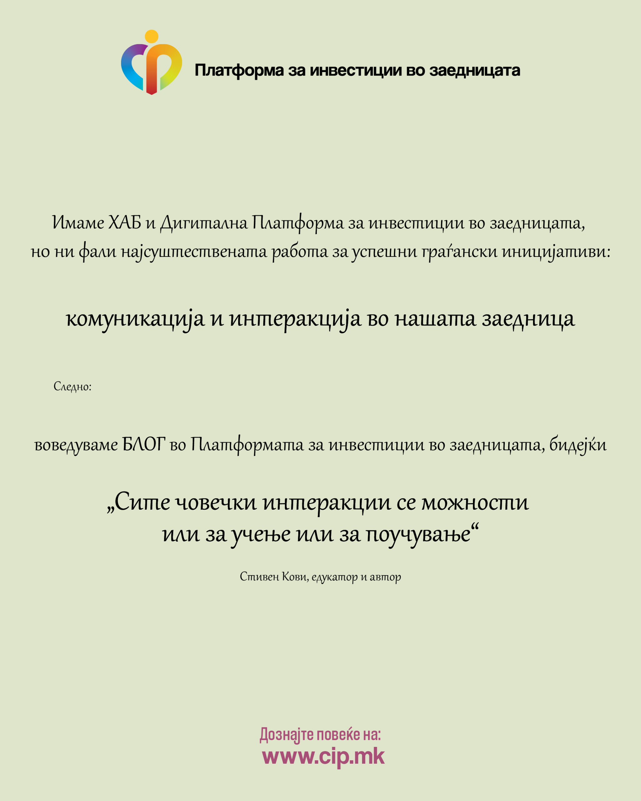 БЛОГ за комуникација, интеракција и размена на идеи за нови иницијативи од различни граѓански перспективи, наскоро ќе биде воведен за големото семејство од 95 членови на Платформата за инвестиции во заедницата.